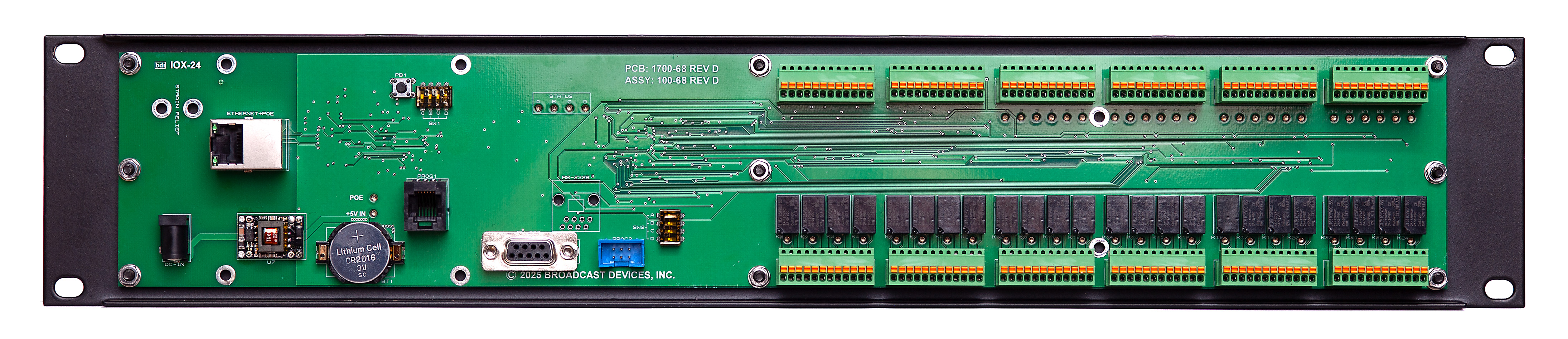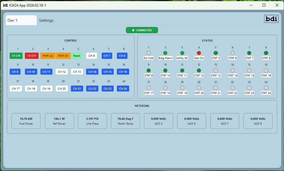 As a standalone remote control, the IOX‑24S requires no cumbersome configuration. The supplied Windows GUI provides complete control and status visibility through an intuitive interface, allowing engineers to manage control relays, monitor status inputs, and view analog metering channels over a standard IP network. The application supports multiple IOX‑24S panels simultaneously, making it easy to supervise several transmitters or studio locations from a single workstation.
